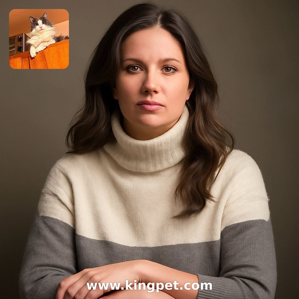 • A majestic fluffy gray and white cat lounges atop a wooden cabinet, gazing down with regal curiosity. The warm lighting highlights the cat's soft fur and the cozy kitchen setting, complete with a toaster oven in the background.