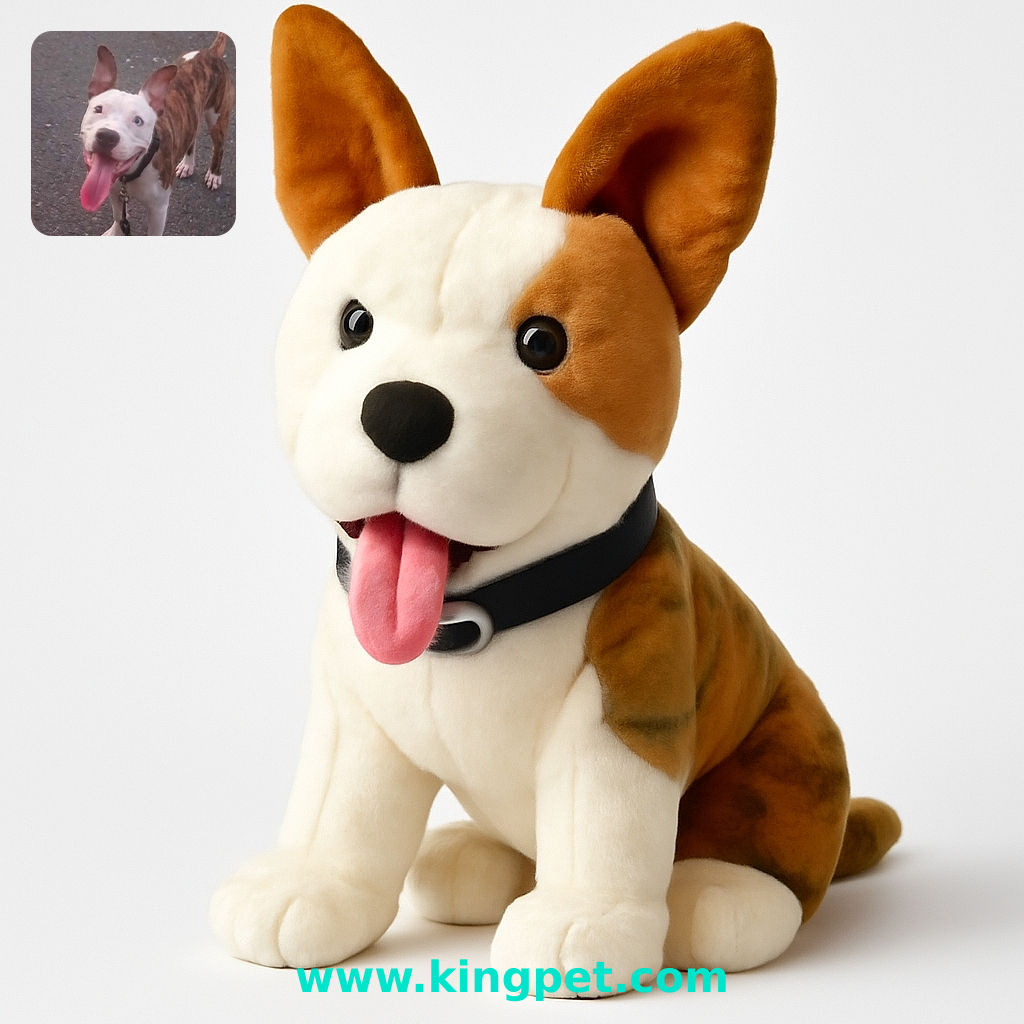 • A happy dog with a big tongue out and perky ears stands on a rough pavement, looking excited and ready for some fun. The dog's white and brindle coat contrasts with the gray asphalt, capturing a candid moment of joyful anticipation.